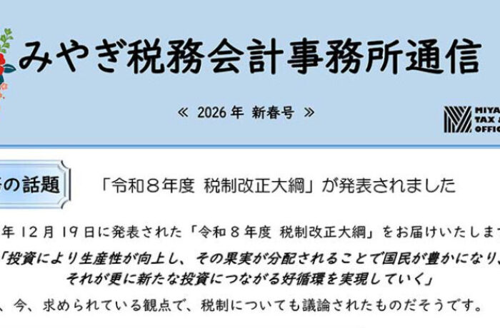 事務所通信 みやぎ税務会計事務所通信 (第84号)... 2026年2月13日 popo31983 税務の話題 「令和8年度 税制改正大綱」が発表されました 令和7年12月19日に発表された「令和8年度 税制改正大綱」をお届けいたします… 詳しく読む